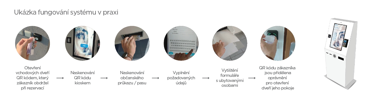 Kiosek příchozího hosta zaregistruje, načte jeho doklad totožnosti, přijme od něj bezhotovostní platbu za ubytování a vytiskne k této platbě odpovídající doklad. Kromě toho navíc funguje i jako přístupový systém pro ovládání dveří jak do jednotlivých pokojů, tak i do samotného ubytovacího zařízení. Přístup do pokojů může být vyřešen na přání zákazníka nejen prostřednictvím QR kódu, ale i RFID kartou, kterou hostovi po jeho registraci automaticky vydá kiosek.