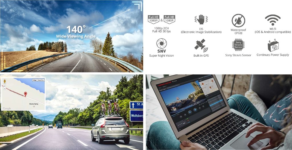 Využívá špičkovou elektronickou stabilizaci obrazu pro plynulé a stabilní záběry v rozlišení 1080p Full HD na přední i zadní kameře. Robustní tělo kamery odolné vůči povětrnostním vlivům s IP68 krytím, navržené pro instalaci na motocykly, čtyřkolky a jiná vozidla 12V, jí umožňuje odolat jakýmkoli podmínkám. Je vybavena užitečnými funkcemi, jako je dálkové ovládání pro ukládání nezapomenutelných momentů a vestavěné GPS a Wi-Fi umožňující rychlý a snadný přístup k záznamům.