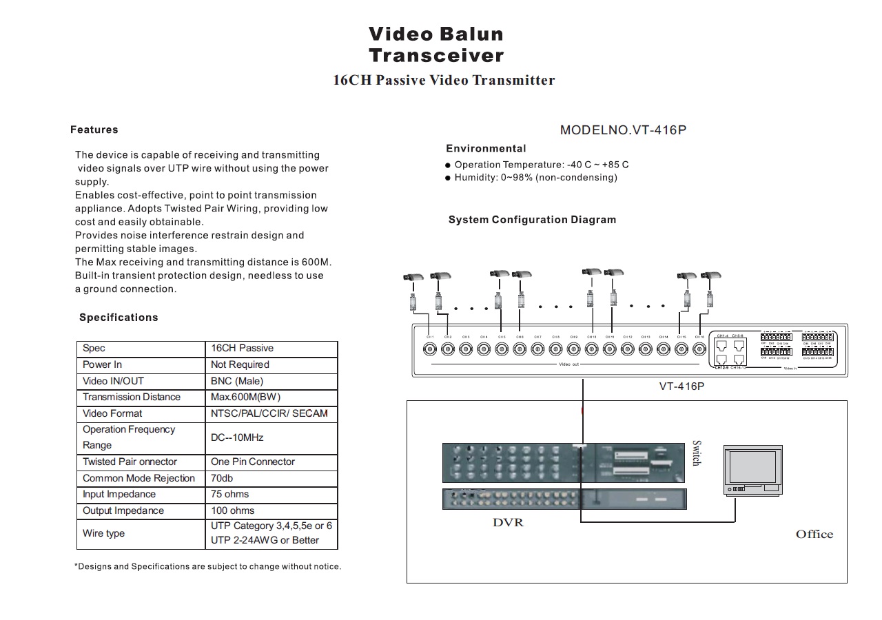 VT-416P Pasivní převodník 16x video, dosah v barvě 330metrů, 16x BNC samec vstup, 4xRJ45 v kombinaci s 16x svorkovnice výstup, rozměry 432x85x50mm - 1U, hmotnost 2,2 kg