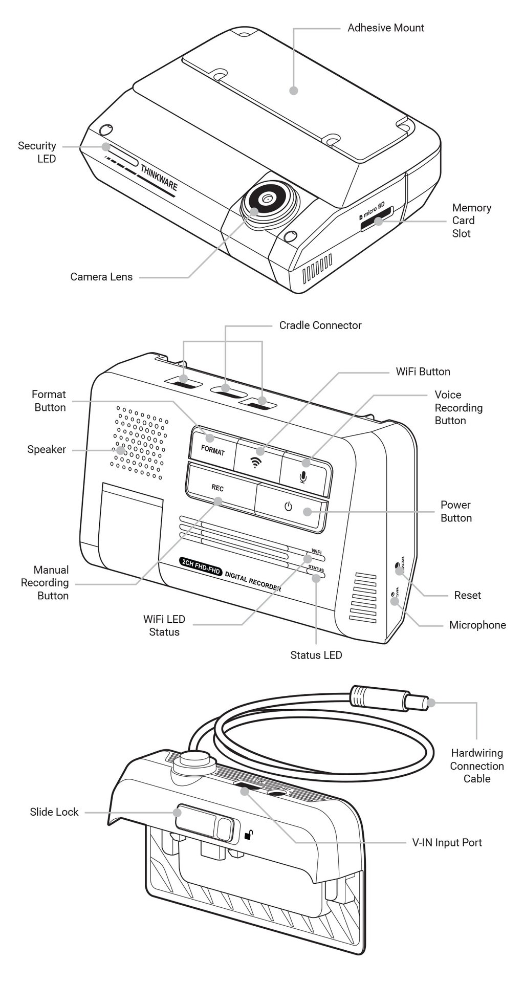 2-kanálová autokamera Thinkware, obsahuje wifi, GPS, parkovací režim, systém lze rozšířit celkem až na 5 objektivů. Obsahuje video výstup pro připojení displeje.